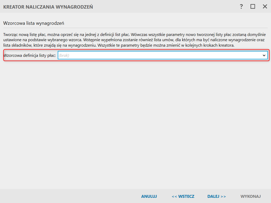 3. Nie wskazywać wzorcowej definicji listy płac i przejść Dalej.