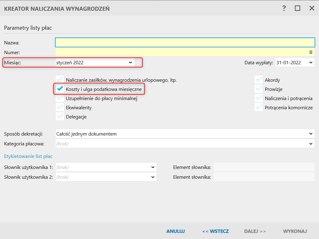 4. Wprowadzić nazwę i numer, wskazać styczeń 2022 (datą wypłaty powinien być wybrany dzień stycznia) i zaznaczyć tylko opcję Koszty i ulga podatkowa miesięcznie​ (w przypadku listy rachu​​nków nie zaznaczać żadnej opcji), następnie kliknąć Dalej.