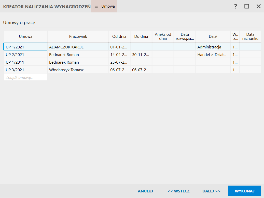 Program powinien wygenerować w ten sposób wypłaty dla wszystkich wskazanych umów. Niektóre z tych wypłat będą zerowe – to te, dla których nie wypłacono w styczniu żadnych wynagrodzeń, lub takie gdzie wynagrodzenia wypłacono, ale obliczona wtedy zaliczka na podatek nie przekroczyła wartości określonej w rozporządzeniu i nie potrzeba dla nich dokonywać zwrotu. Takie wypłaty można zbiorczo oznaczyć i usunąć.