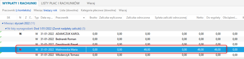 W artykule zwroty nadpłaconych zaliczek zostaną wyliczone na zupełnie osobnej liście płac (rachunków), żeby wykazać zwrócone kwoty dla każdego pracownika z osobna.