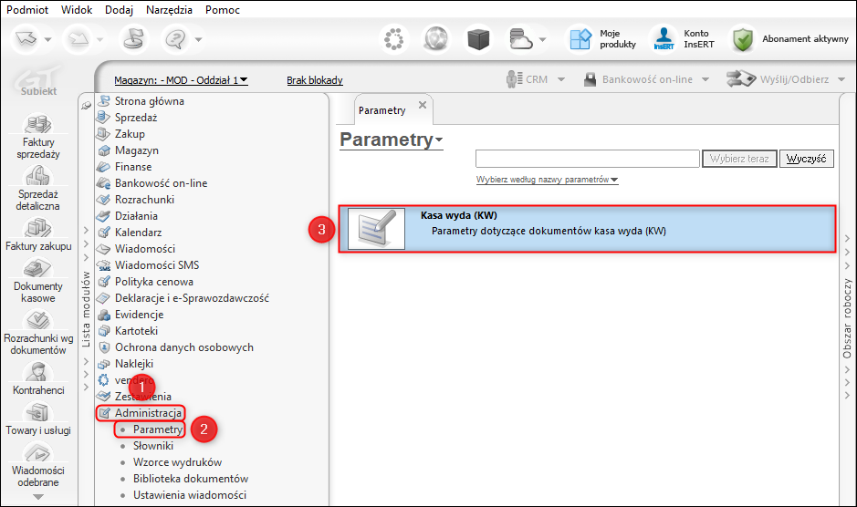 1. Z listy modułów wybrać Administracja – Parametry, a z listy parametrów Kasa wyda.