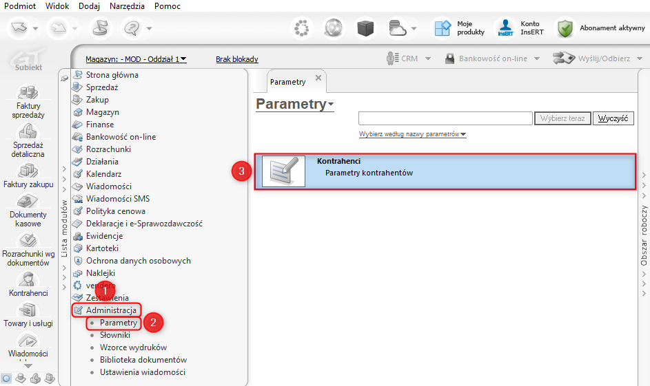 1. Z listy modułów wybrać Administracja – Parametry, a z listy parametrów Kontrahenci.
