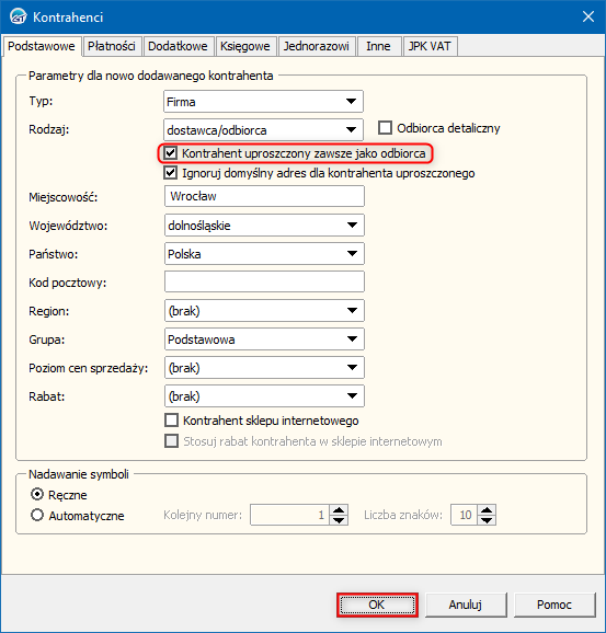 2. W oknie, które się wyświetli zaznaczyć opcję Kontrahent uproszczony zawsze jako odbiorca. Zmiany zapisać przyciskiem OK.