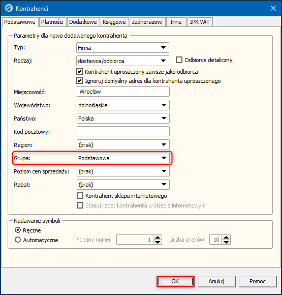 2. W oknie, które się wyświetli wskazać domyślną Grupę w sekcji Parametry dla nowo dodawanego kontrahenta. Zmiany zapisać przyciskiem OK.