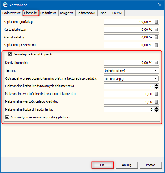 2. W oknie, które się wyświetli przejść na zakładkę Płatności i wprowadzić domyślne ustawienia dla kredytu kupieckiego. Zmiany zapisać przyciskiem OK.
