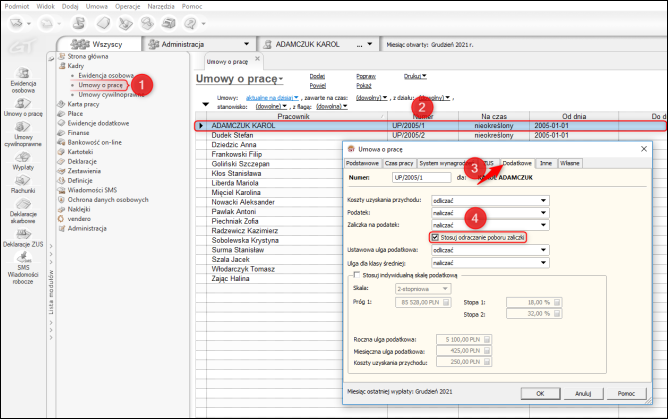 Aby naliczone wynagrodzenie było zgodne z rozporządzeniem Ministra Finansów w sprawie przedłużenia terminów poboru i przekazania przez niektórych płatników zaliczek na podatek dochodowy od osób fizycznych, to należy w umowie zaznaczyć checkbox ​ Stosuj odraczanie poboru zaliczki. W tym celu należy przejść do modułu Umowy, otworzyć umowę pracownika, przejść na zakładkę Dodatkowe i zaznaczyć Stosuj odraczanie poboru zaliczki.