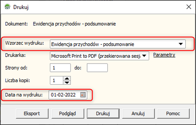 W parametrach wydruku wybrać wzorzec oraz określić datę wydruku.