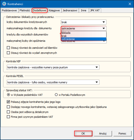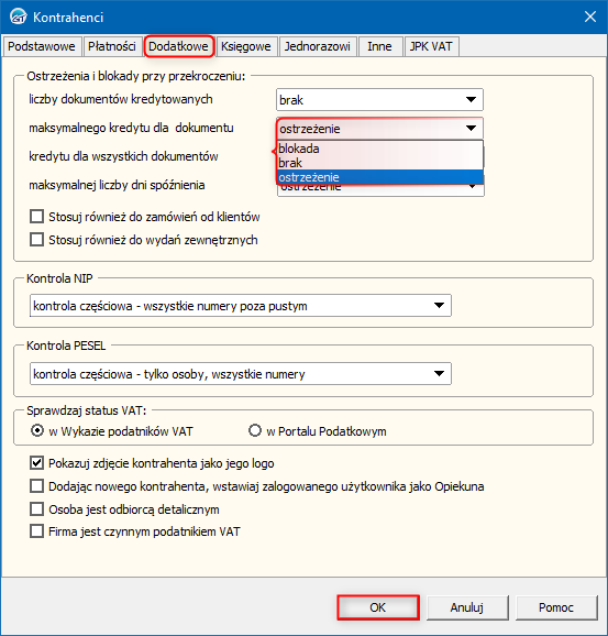 2. W oknie, które się wyświetli przejść na zakładkę Dodatkowe i w polu Ostrzeżenia i blokady przy przekroczeniu maksymalnego kredytu dla dokumentu wybrać jedną z trzech opcji:
