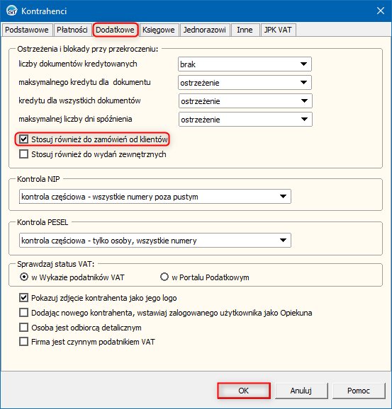 2. W oknie, które się wyświetli przejść na zakładkę Dodatkowe i zaznaczyć opcję Stosuj również do zamówień od klientów w sekcji Ostrzeżenia i blokady przy przekroczeniu. Zaznaczenie tego znacznika spowoduje, że parametry powyżej będą również stosowane podczas wystawiania zamówień. Zmiany zapisać przyciskiem OK.