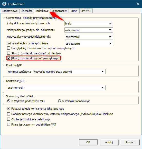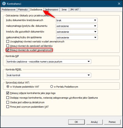 2. W oknie, które się wyświetli przejść na zakładkę Dodatkowe i zaznaczyć opcję Stosuj również do wydań zewnętrznych w sekcji Ostrzeżenia i blokady przy przekroczeniu. Zaznaczenie tego znacznika spowoduje, że parametry powyżej będą również stosowane podczas wystawiania zamówień. Zmiany zapisać przyciskiem OK.