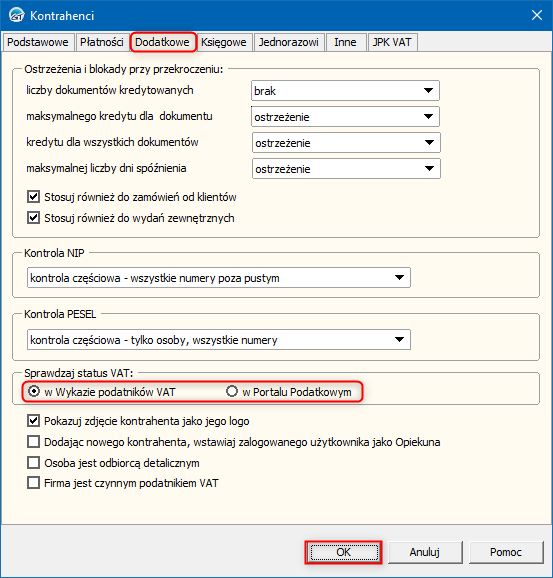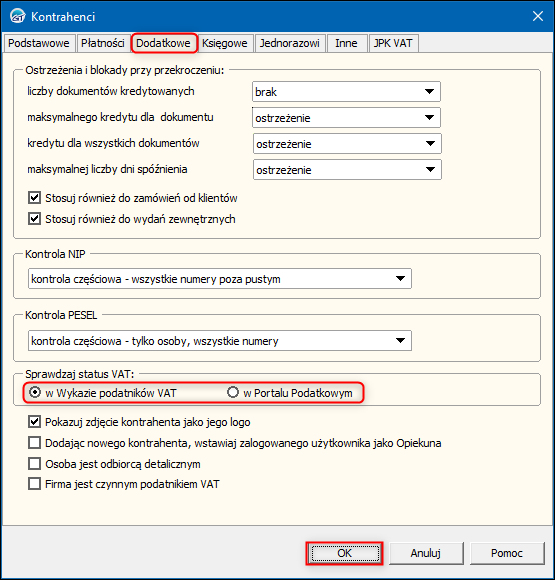 2. W oknie, które się wyświetli przejść na zakładkę Dodatkowe i w sekcji Sprawdzaj status VAT wybrać, czy weryfikacja statusu VAT ma odbywać się w Wykazie podatników VAT, czy w Portalu Podatkowym. Zmiany zapisać przyciskiem OK.