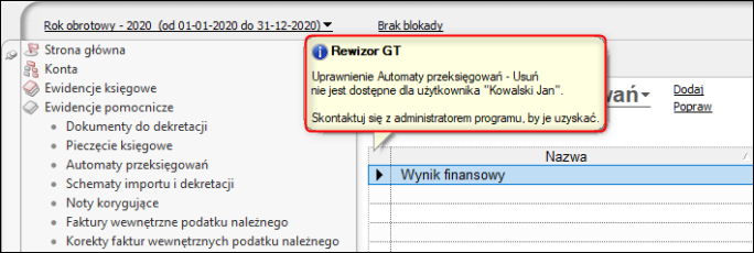 Rezultatem odebrania uprawnień będzie blokada możliwości usuwania pieczęci księgowych potwierdzona odpowiednim komunikatem.