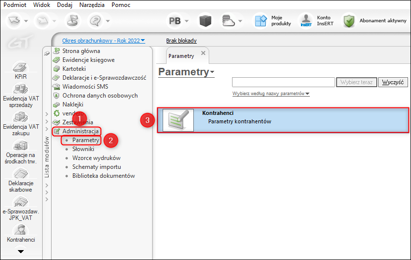 1. Z listy modułów wybrać Administracja – Parametry, a z listy parametrów Kontrahenci.