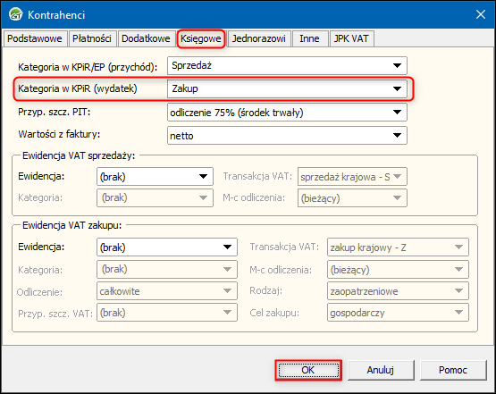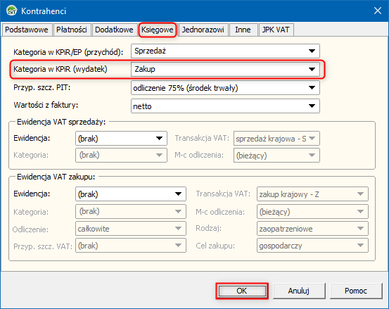 2. W oknie, które się wyświetli przejść na zakładkę Księgowe i wybrać domyślną Kategorię w KPiR (wydatek). Zmiany zapisać przyciskiem OK.