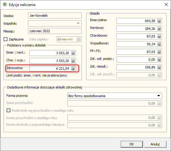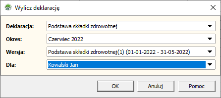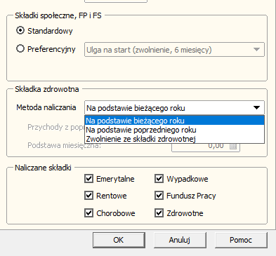 - Na podstawie bieżącego roku (wymaga wyliczania co miesiąc raportu Podstawa składki zdrowotnej. Raport dostępny jest w module Deklaracje skarbowe)