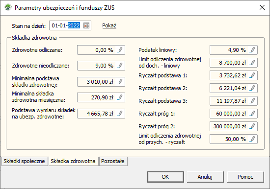 Parametry ubezpieczeń i funduszy ZUS (moduł Administracja – Parametry – Ubezpieczenia i fundusze ZUS na zakładce Składka zdrowotna)
