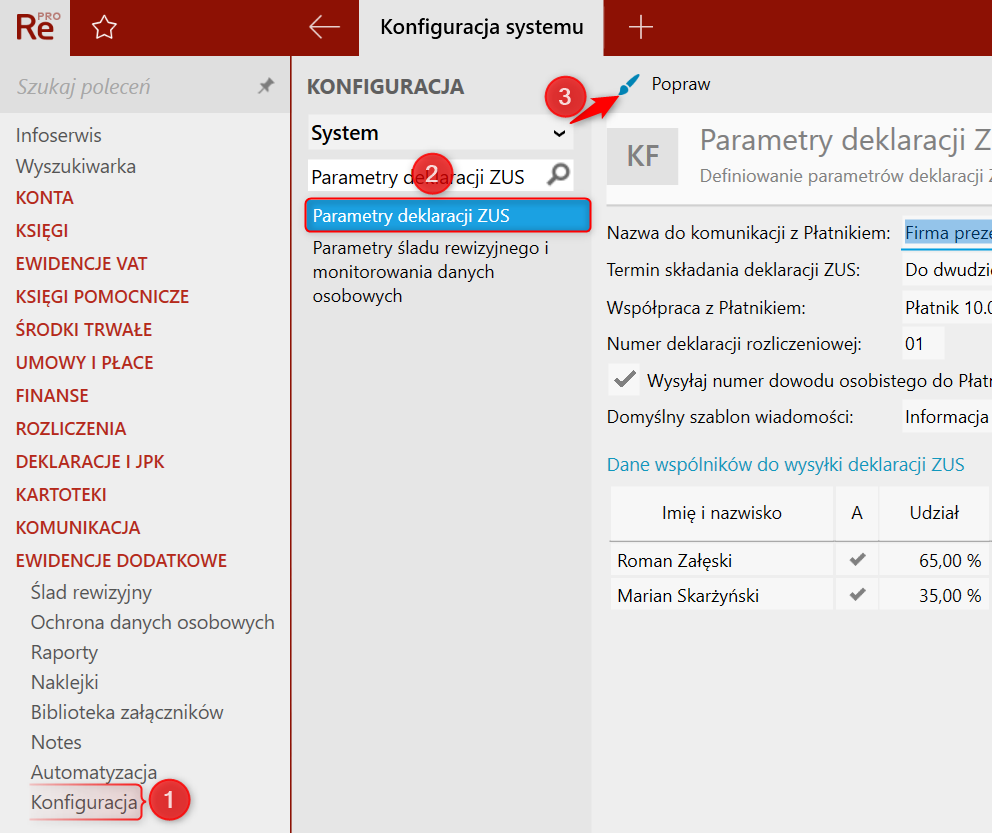 1. Przejść do modułu Ewidencje dodatkowe – Konfiguracja – Parametry deklaracji ZUS i z górnego menu wybrać Popraw.