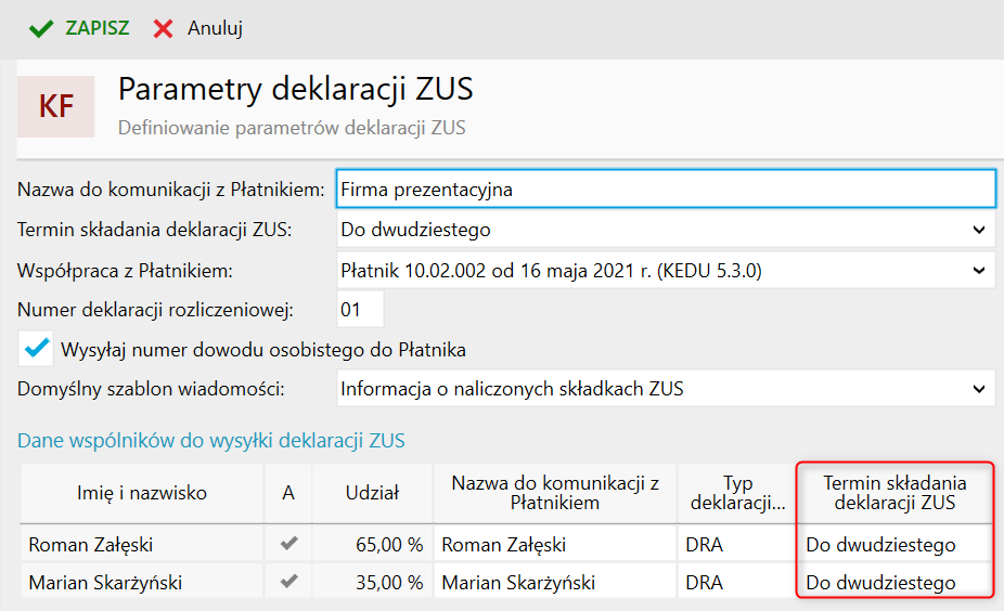 2. Przy każdym ze wspólników wybrać preferowaną datę składania deklaracji ZUS i zatwierdzić zmiany przyciskiem Zapisz.