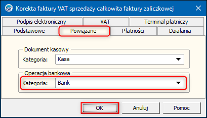 2. W oknie, które się wyświetli przejść na zakładkę Powiązane i wybrać domyślną Kategorię w sekcji Operacja bankowa. Zmiany zapisać przyciskiem OK.