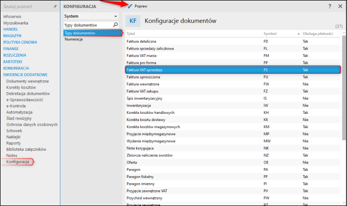 1. Przejść do modułu Ewidencje dodatkowe – Konfiguracja – Typy dokumentów, wybrać Fakturę VAT sprzedaży i z górnego menu wybrać Popraw.