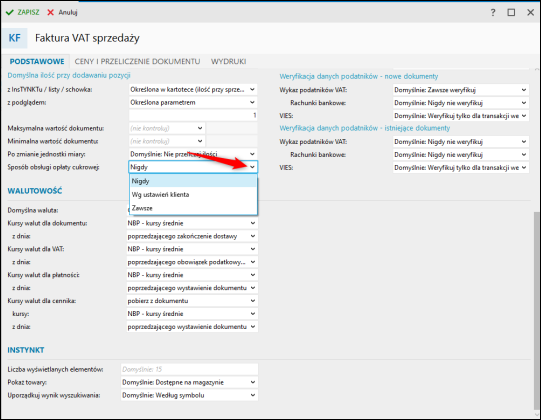 2. W sekcji Sposób obsługi opłaty cukrowej wybrać Nigdy i zapisać zmiany.