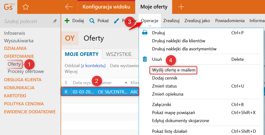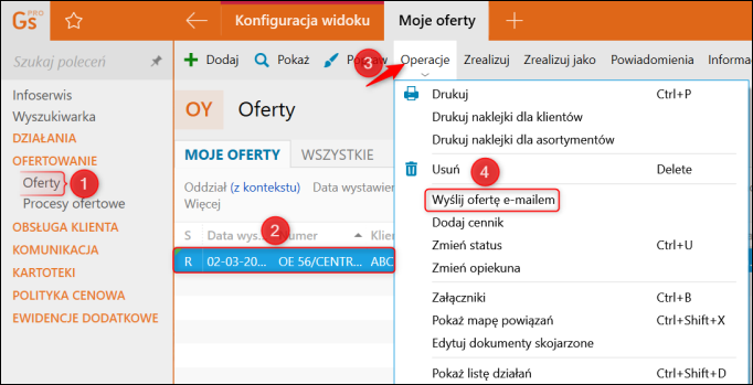1. W module Oferty zaznaczyć Ofertę utworzoną na podstawie Procesu ofertowego rozwinąć górne menu Operacje i wybrać Wyślij ofertę e-mailem.