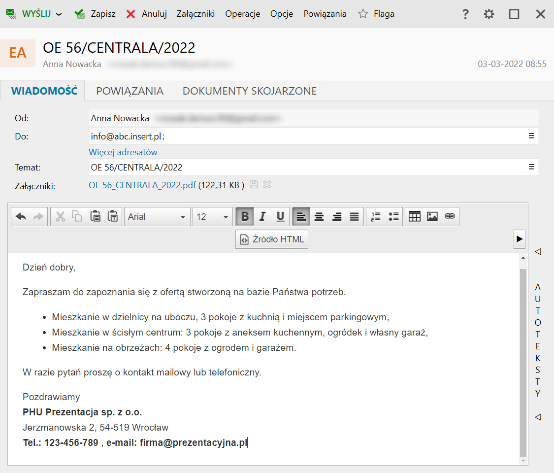 Informacje o tworzeniu własnych Szablonów wiadomości i korzystania z Autotekstów można znaleźć w temacie e-Pomocy technicznej InsERT nexo – Jak dodać szablon wiadomości e-mail?.