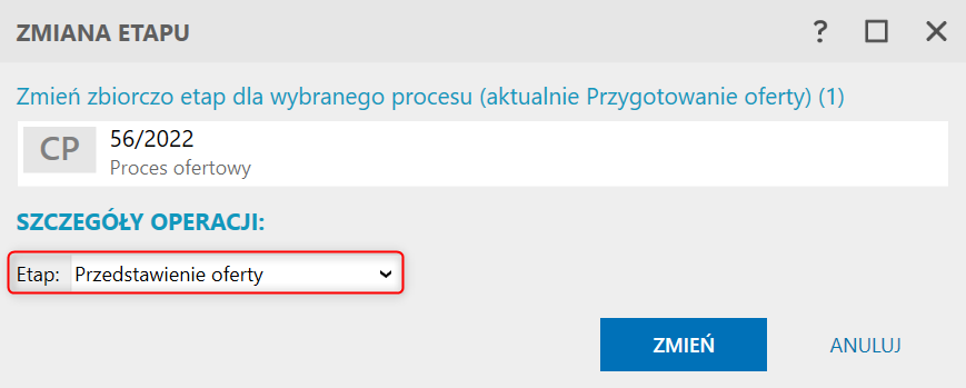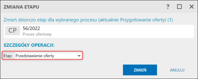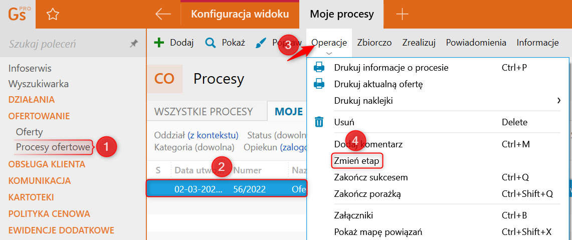 3. Przejść do modułu Procesy ofertowe, zaznaczyć Proces ofertowy, rozwinąć górne menu Operacje i wybrać Zmień etap.