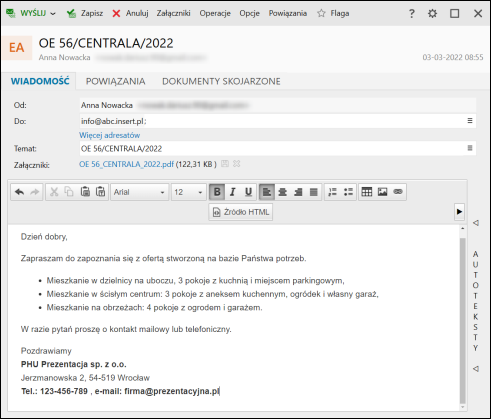 Powyższą czynność można zautomatyzować. Więcej o automatyzacji tego kroku można przeczytać w temacie e-Pomocy technicznej Agencja nieruchomości – Automatyzacja wysyłki oferty do klienta