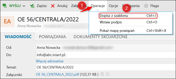 W tym punkcie warto zwrócić uwagę na możliwość korzystania z wcześniej zdefiniowanych Szablonów wiadomości. Wczytuje się je z poziomu tworzonej wiadomości, rozwijając górne menu Operacje i wybierając Dopisz z szablonu.
