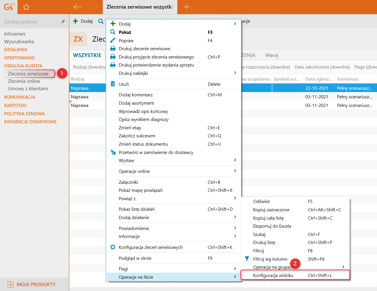 1. Przejść do modułu Obsługa klienta – Zlecenia serwisowe, kliknąć prawym przyciskiem myszy na dowolnym miejscu tabeli i z menu wybrać Operacje na liście – Konfiguracja widoku.