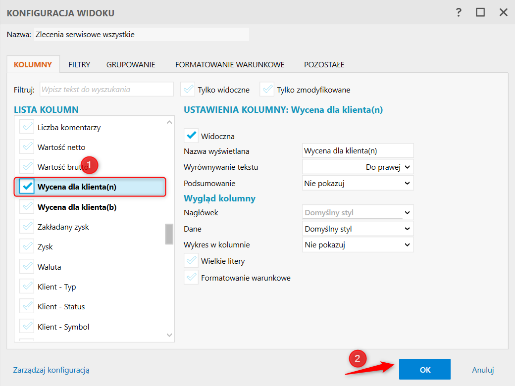 2. Na zakładce Kolumny wybrać z listy Wycena dla klienta(n), a zmiany zatwierdzić przyciskiem OK.