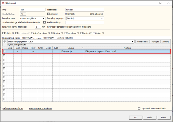 3. Na liście uprawnień odznaczyć pozycję o nazwie Eksploatacja pojazdów - Usuń​. Aby zapisać zmiany, należy wybrać OK