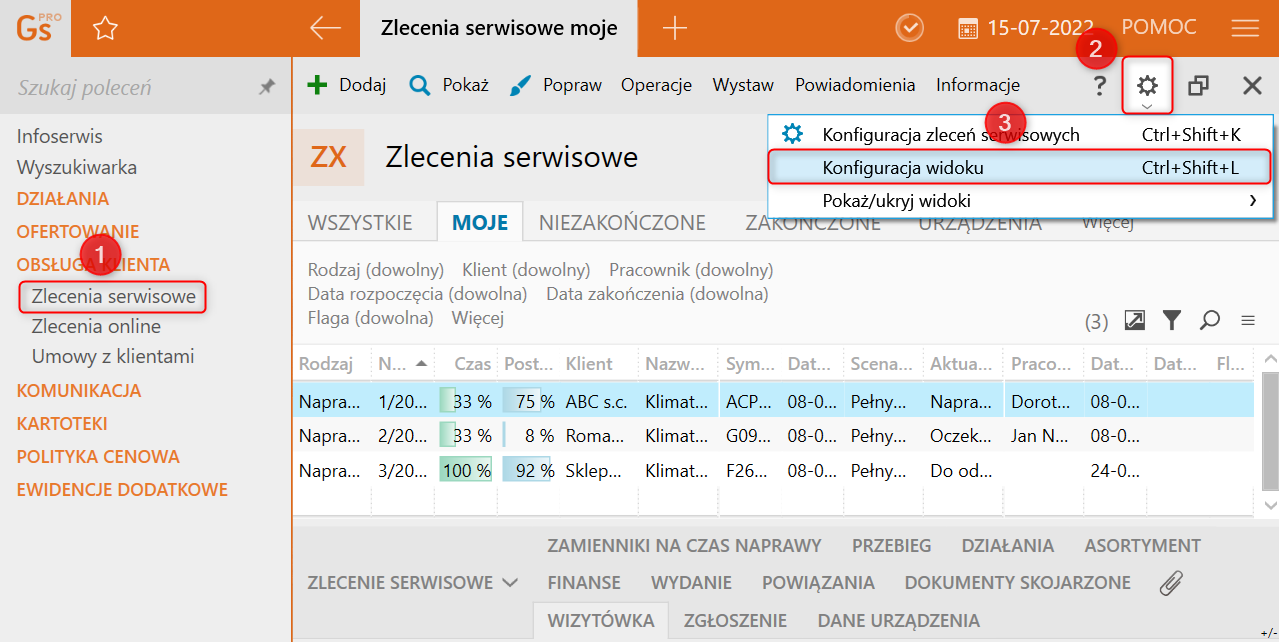 1. Przejść do modułu Obsługa klienta – Zlecenia serwisowe, kliknąć prawym przyciskiem myszy na dowolnym miejscu tabeli i z menu wybrać Operacje na liście – Konfiguracja widoku.