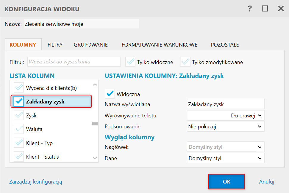 2. Na zakładce Kolumny wybrać z listy Zakładany zysk, a zmiany zatwierdzić przyciskiem OK.