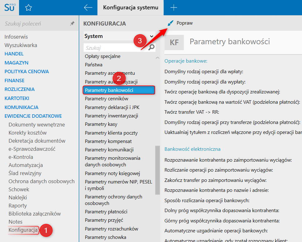 1. Przejść do modułu Konfiguracja – Parametry bankowości, następnie kliknąć Popraw.
