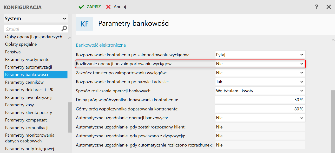 2. W sekcji Bankowość elektroniczna parametr Rozliczanie operacji po zaimportowaniu wyciągów ustawić na Nie. Zapisać zmiany.