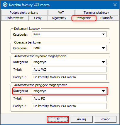 2. W oknie, które się wyświetli przejść na zakładkę Powiązane i wybrać domyślną Kategorię w sekcji Automatyczne przyjęcie magazynowe. Zmiany zapisać przyciskiem OK.