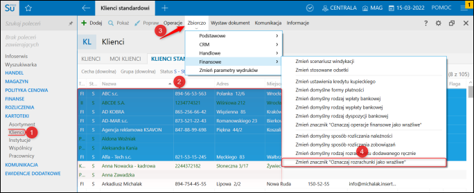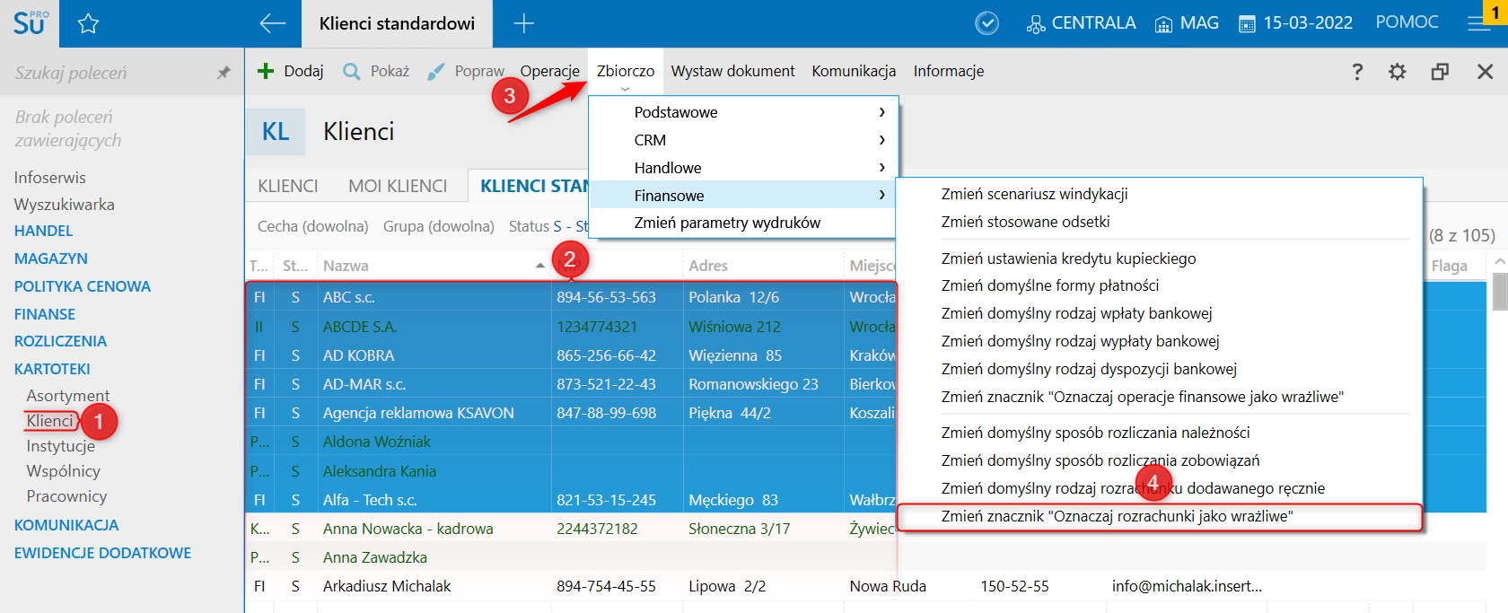 1. Przejść do modułu Klienci, zaznaczyć klientów na liście, a następnie wybrać z górnego menu ZbiorczoFinansowe – Zmień znacznik „Oznaczaj rozrachunki jako wrażliwe".