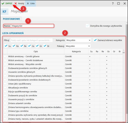 3. Podać Nazwę roli, zweryfikować uprawnienia i kliknąć Zapisz.