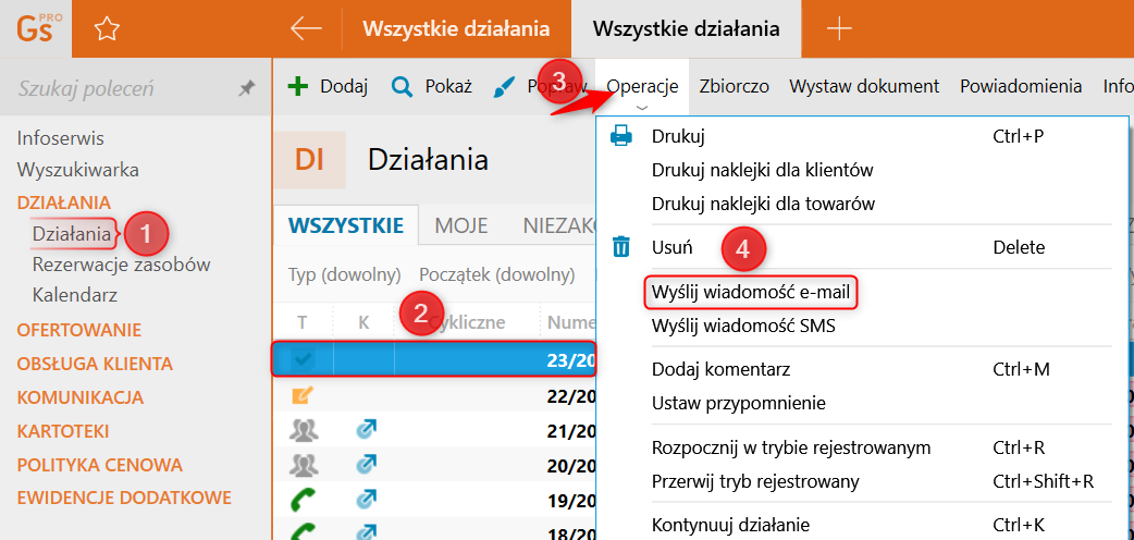 1. Z poziomu modułu Działania zaznaczyć wcześniej edytowane Działania typu Zadanie, rozwinąć górne menu Operacje i wybrać Wyślij wiadomość e-mail.