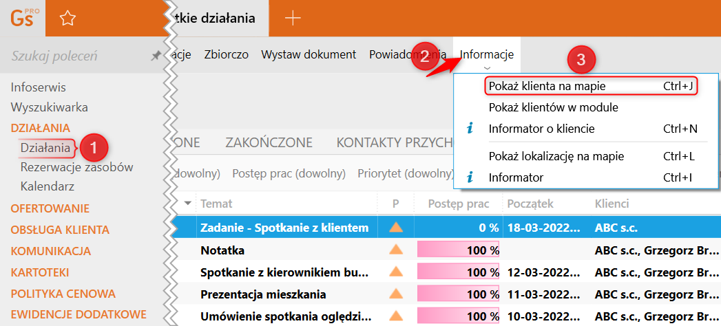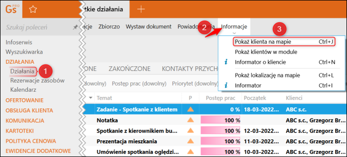 Pracownik – doradca finansowy sprawdza swoje zadania „na dziś" – jest tam spotkanie z klientem w sprawie doradztwa finansowego. Wysyła do klienta e-mail z informacją o umówionym spotkaniu, aby sprawdzić gdzie dokładnie mieszka klient, korzysta z opcji – Pokaż klienta na mapie (może być z poziomu kalendarza, w którym dodawał spotkanie). Aby odwzorować w programie powyższe czynności, należy: