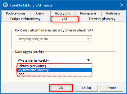 2. W oknie, które się wyświetli przejść na zakładkę VAT i w polu Data ujęcia korekty wybrać jedną z trzech opcji:
