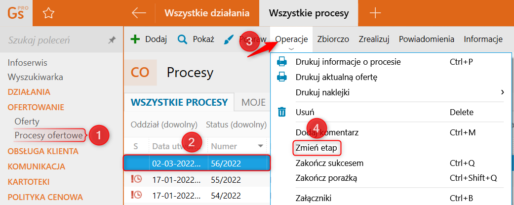 1. Przejść do modułu Procesy ofertowe, zaznaczyć Proces ofertowy, rozwinąć górne menu Operacje i wybrać Zmień etap.