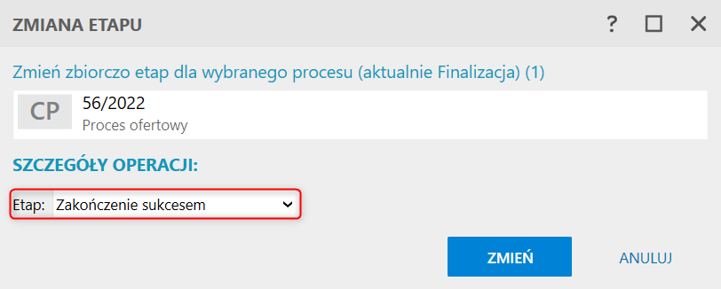 2. Wybrać odpowiedni Etap i zatwierdzić przyciskiem Zmień.