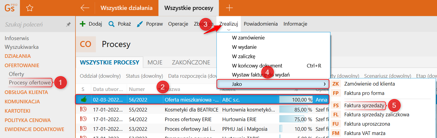 3. Ponownie zaznaczyć Proces ofertowy, rozwinąć górne menu Zrealizuj, kliknąć Jako i wybrać Faktura sprzedaży.
