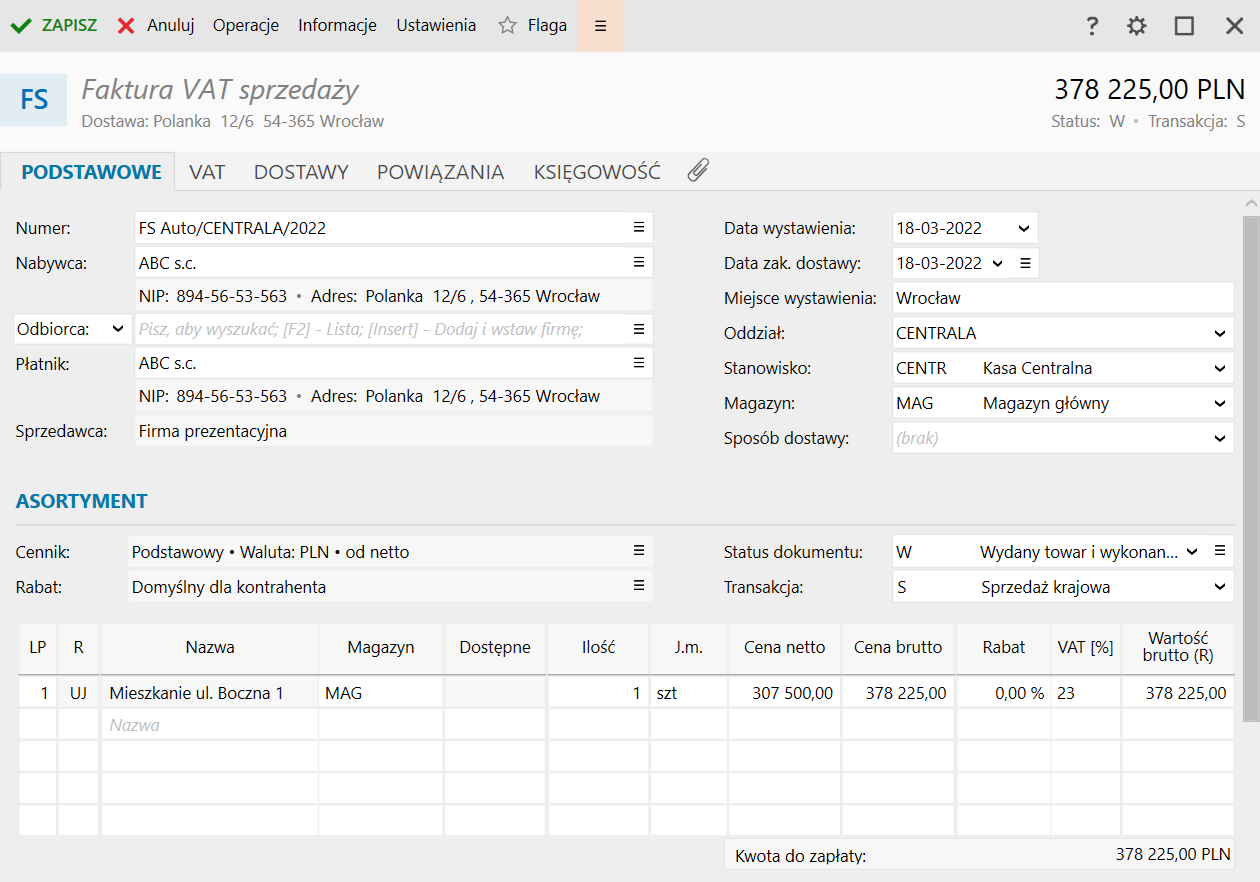 4. Zatwierdzić Fakturę sprzedaży klikając górne menu Zapisz.