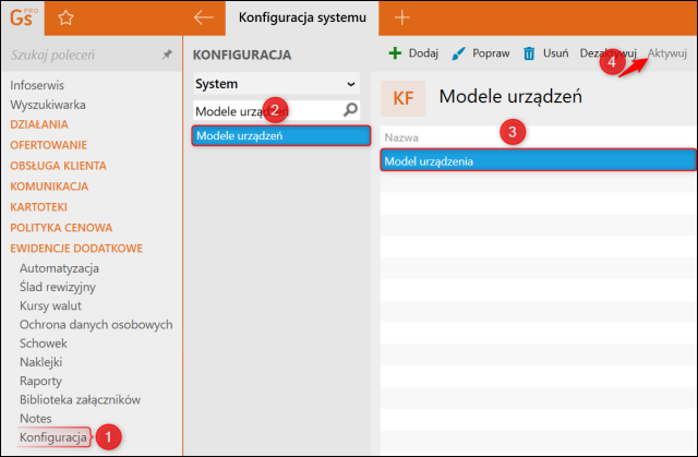 W celu aktywowania takiego modelu należy przejść do modułu Ewidencje dodatkowe – Konfiguracja – Modele urządzeń, zaznaczyć wybrany model i z górnego menu wybrać Aktywuj.