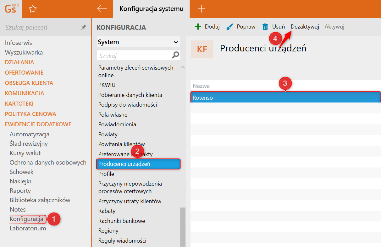1. Przejść do modułu Konfiguracja – Producenci urządzeń, zaznaczyć wybranego producenta i z górnego menu ​wybrać Dezaktywuj.