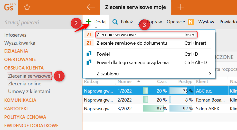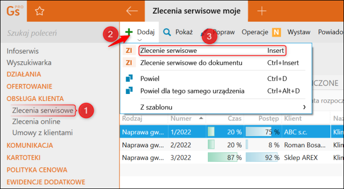 1. Przejść do modułu Zlecenia serwisowe, kliknąć przycisk Dodaj i wybrać Zlecenie serwisowe.